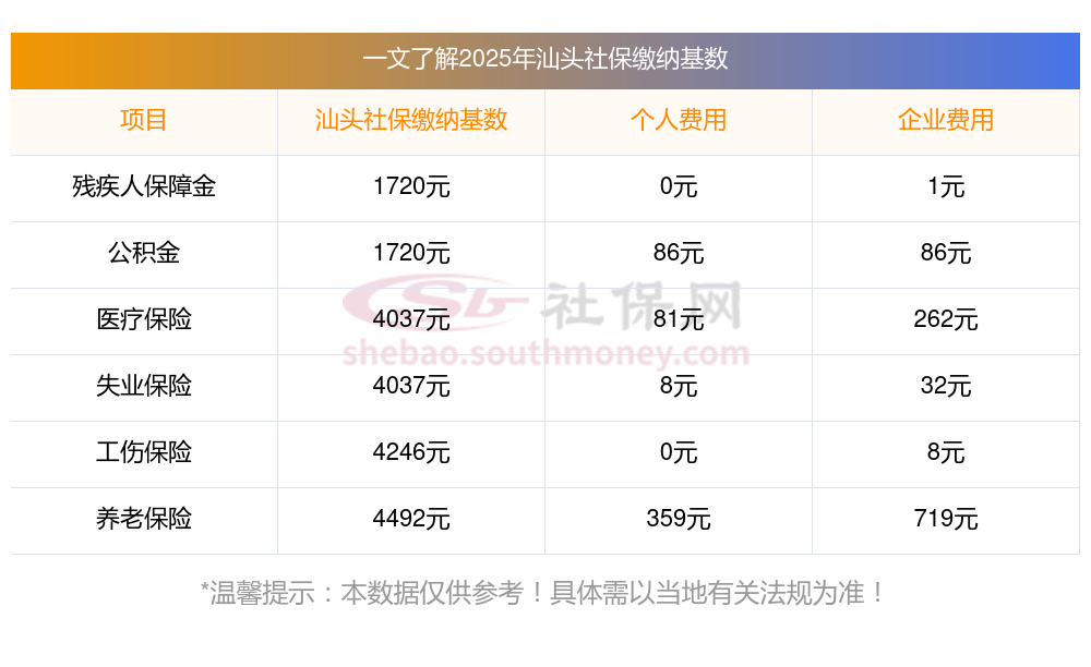 一、据新社通小编了解到,社保缴费基数主要依据职工上一年度月均工资来确定,同时要结合当地社会平均工资在60%至300%之间的上下限标准进行调整。 目前,汕头社保缴费基数为:4492.00,个人费用约为:359.36元,企业费用约为:718.72元。