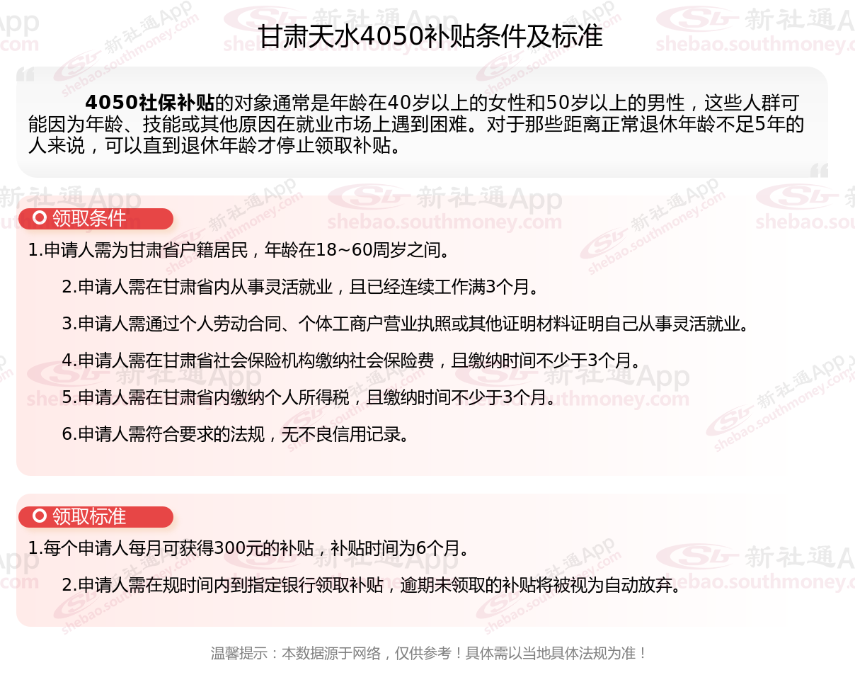 二、2025年甘肃天水4050社保补贴标准及条件,最新如下: