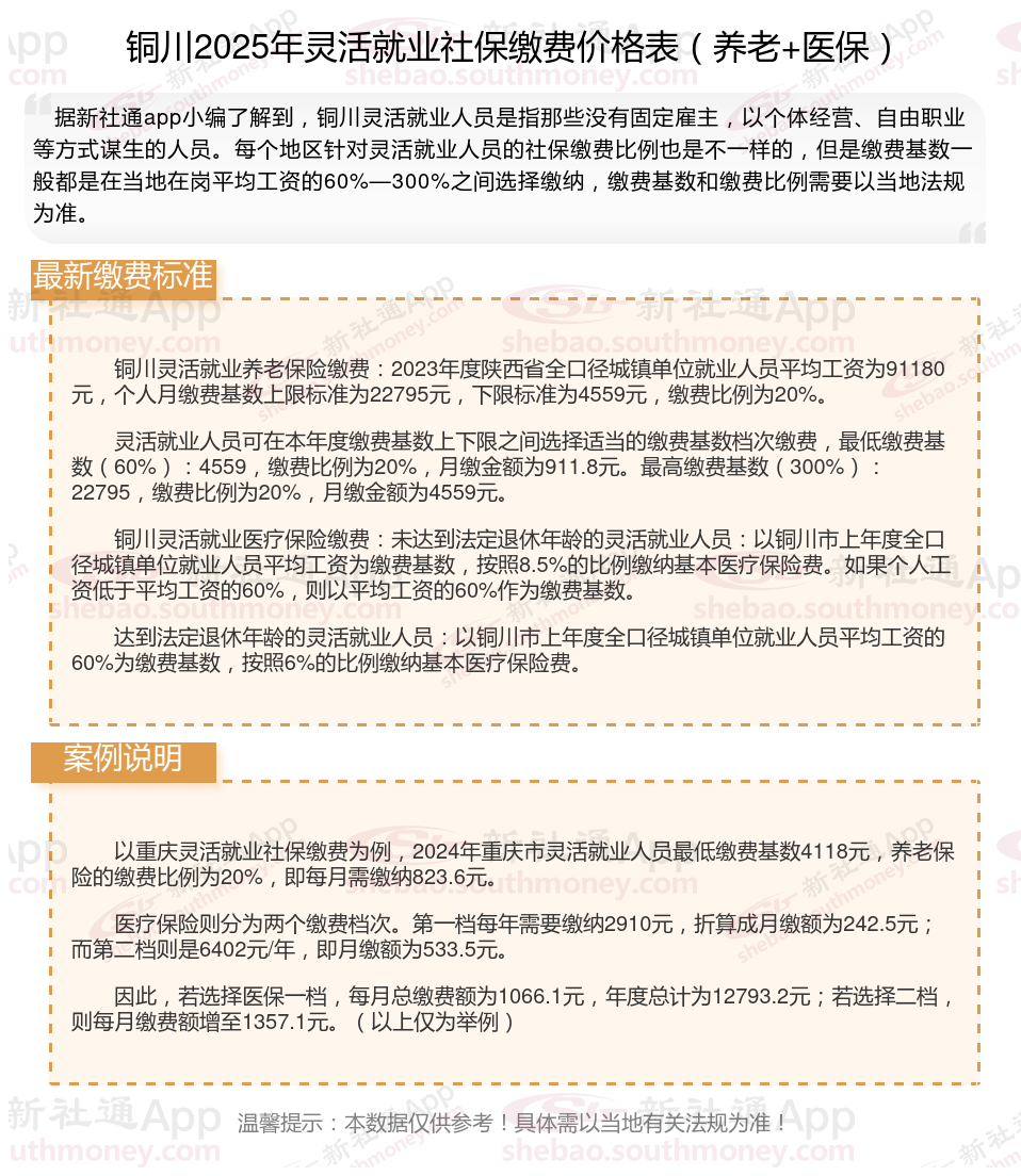 2025年铜川灵活就业人员社保需要交多少钱?灵活就业,作为一种非传统的就业方式,近年来蓬勃发展。为保护这部分人群的权益,国制定了相应的社保缴费法规。2024年,灵活就业社保缴费法规继续完善,涵盖了养老保险、医疗保险、失业保险等多个方面,旨在为灵活就业人员提供全面的社会保证。接下来随新社通APP小编一起来看看。