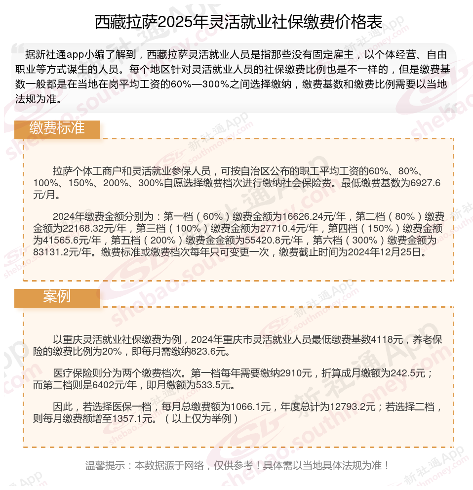 据新社通app显示,2024-2025年西藏拉萨灵活就业养老保险的缴费标准: