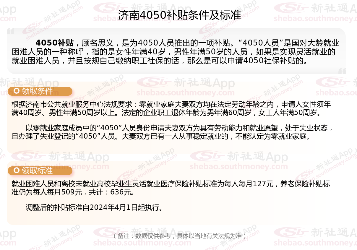 济南40、50、60 年出生人群补贴需要符合什么条件,4050补贴需要哪些资料?4050补贴的享受对象年龄要求:女性年满40周岁,男性年满50周岁。