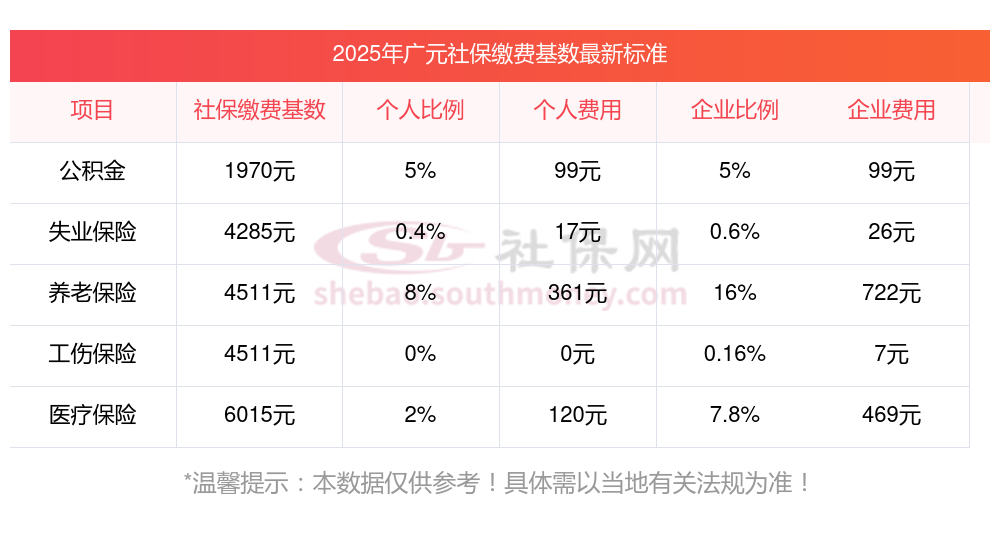 2025年广元社保个人缴费基数及标准比例是多少,据新社通小编了解到,社保缴费基数的确立,首先依赖职工上一年度月平均工资,然后根据当地社会平均工资60%-300%的上下限区间进行调整。 目前,广元社保缴费基数为:4511.00,个人费用约为:360.88元,企业费用约为:721.76元。