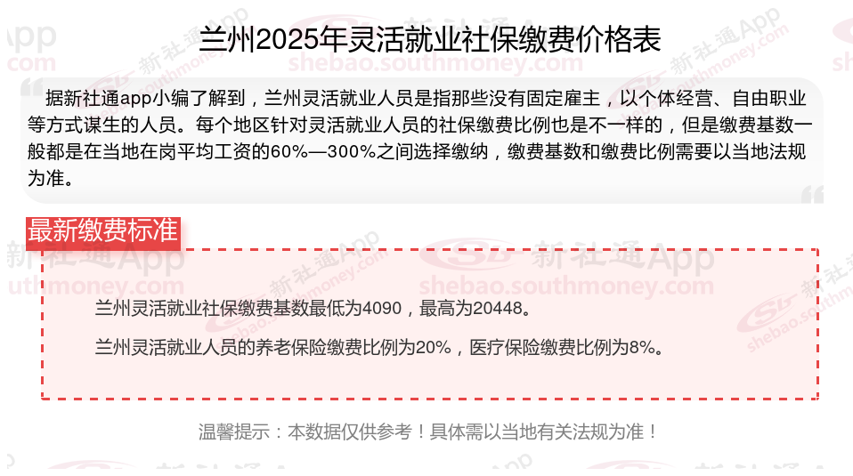 兰州灵活就业社保缴费基数最低为4090,最高为20448。