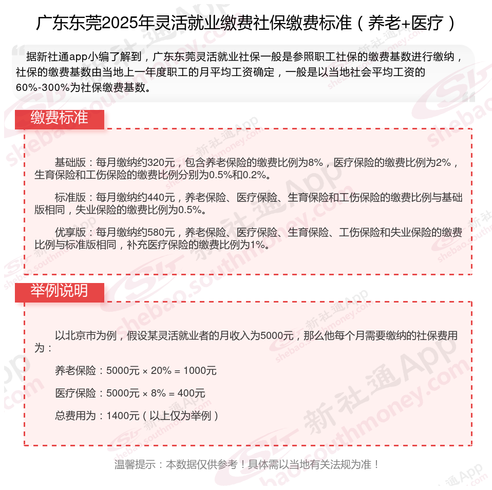 广东东莞灵活就业人员社保缴费标准来了 广东东莞灵活就业人员缴费多少钱怎么查?根据新社通app-社保缴费查询工具提供的2025社保缴费标准详情数据如下: