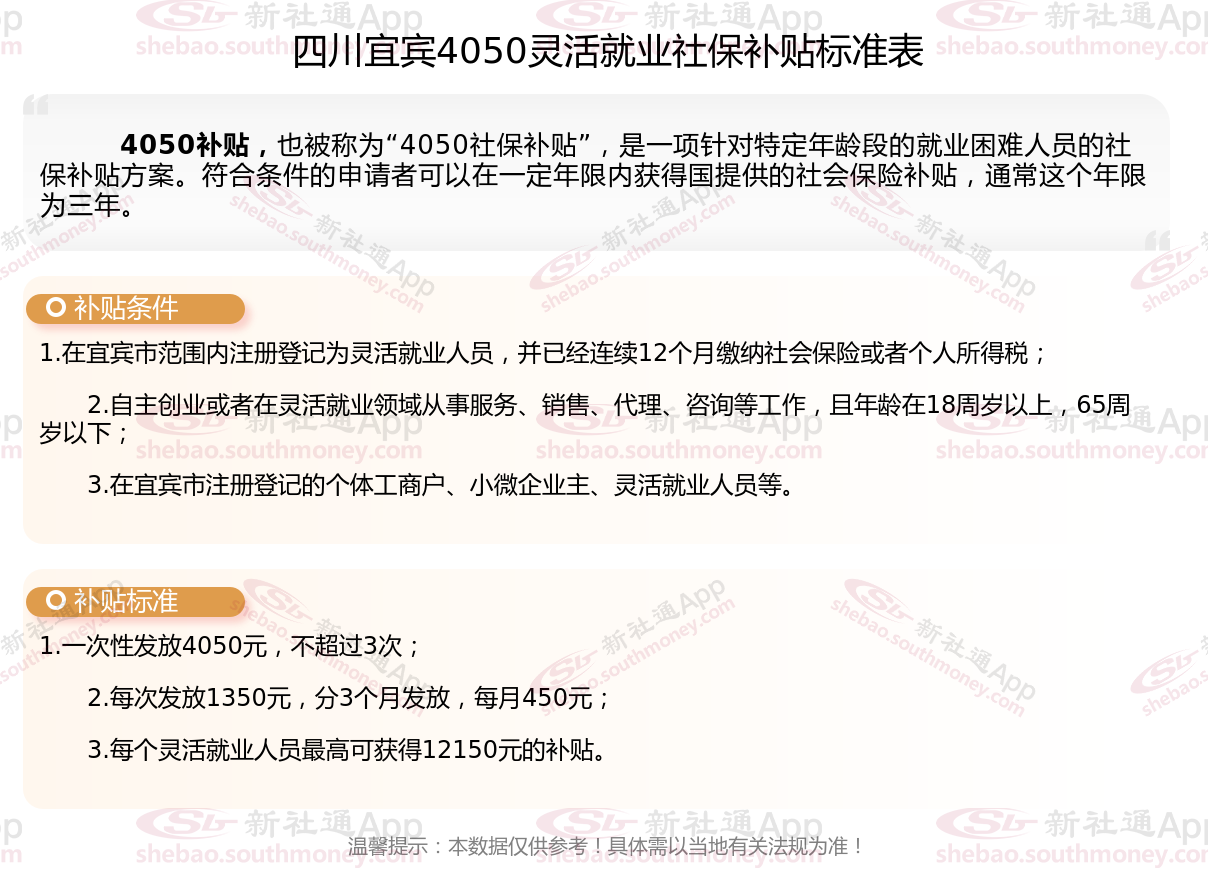 4050补贴主要是针对大龄就业困难人群的社保补贴,申请条件包括年龄、就业困难、灵活就业并自费缴纳社保,需要持有失业登记证,不同地区可能有细微差别,比如农村户口的限制。那么四川宜宾4050灵活就业社保补贴标准是多少钱?四川宜宾4050社保补贴条件是什么?接下来随新社通APP小编了解一下最新资讯。