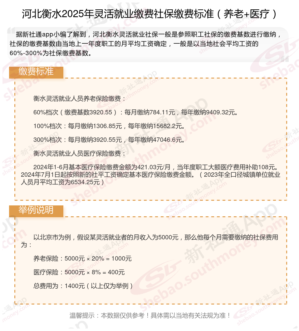 河北衡水灵活就业社保缴费标准来了 灵活就业人员保险一个月交多少钱?根据新社通app-社保缴费查询工具提供的最新数据如下: