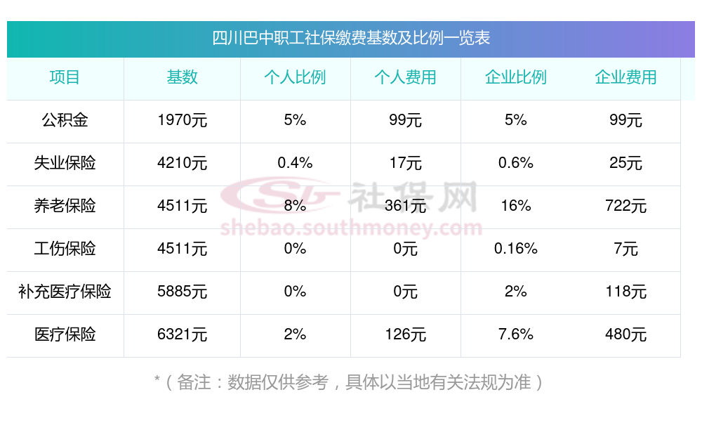 据新社通app小编了解到,2025年四川巴中社保缴费基数参照为3579.00,四川巴中社保缴费明细如下: