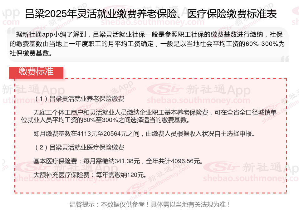吕梁灵活就业社保缴费价格表 2024-2025年吕梁灵活就业养老、医保缴费标准一览表,下表是2024-2025年吕梁社保费用明细参考,根据新社通app-社保缴费查询工具提供的最新数据如下: