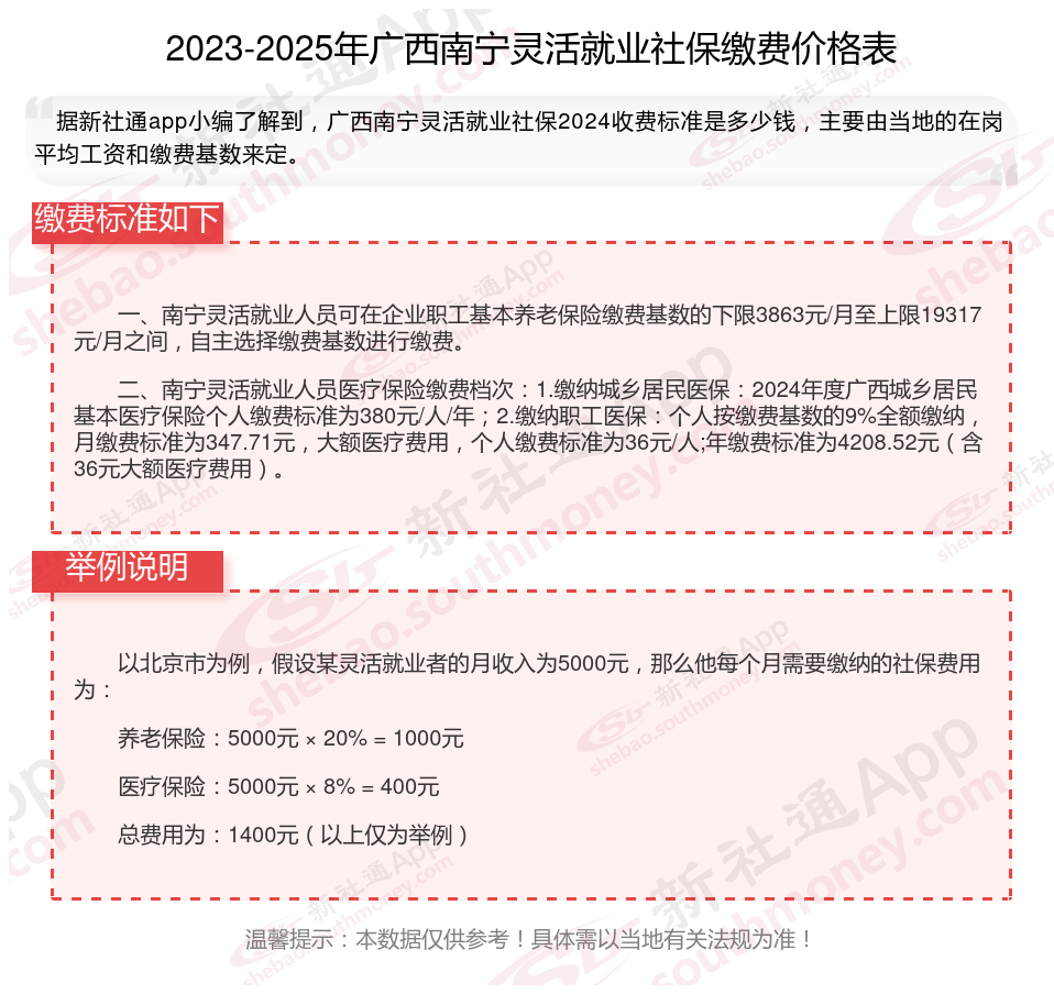 随着经济社会的不断发展,灵活就业群体日益壮大,其社保缴费问题也愈发受到关注。那么2025年广西南宁灵活就业人员社保需要交多少钱,缴费比例是多少?下面随新社通小编一起来看看。