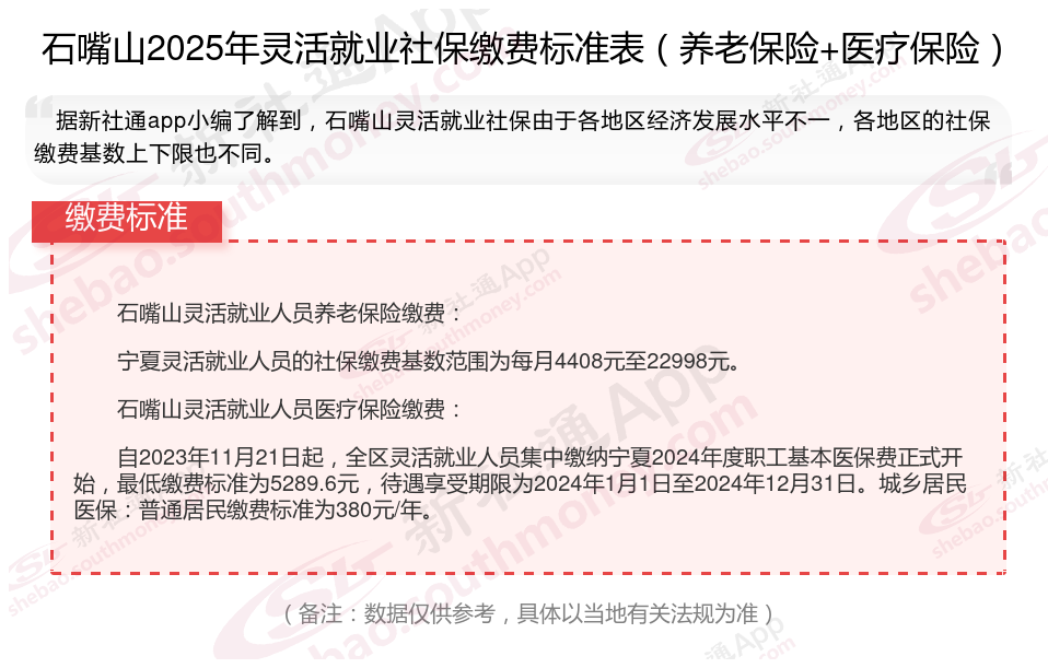 据新社通app数据显示,石嘴山灵活就业养老保险缴费基数2024-2025年最新标准如下:
