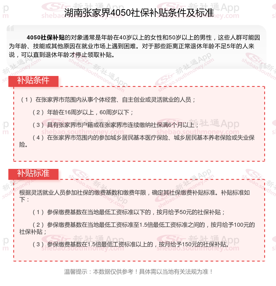 4050社保补贴标准据新社通app小编了解,通常,4050社保补贴包含基本医疗保险和基本养老保险两个险种,社保补贴金额为申请人实际缴纳基本养老保险和基本医疗保险金额的2/3,具体标准以当地社保局公布的数据为准!那么湖南张家界4050灵活就业困难人员社保补贴标准是多少?湖南张家界4050社保补贴需要符合什么条件?接下来随新社通APP小编具体了解一下4050社保补贴内容。
