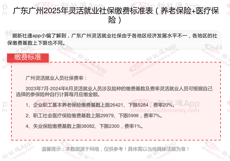 据新社通app数据显示,广东广州灵活就业养老保险缴费基数2024-2025年最新标准如下: