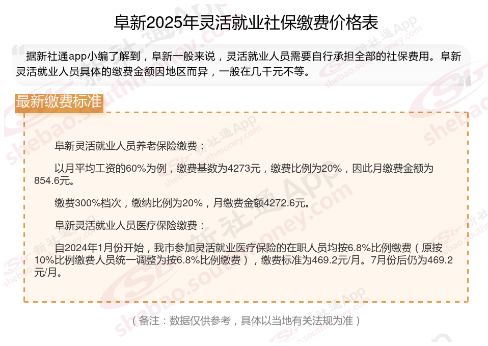 据新社通app数据显示,阜新灵活就业养老保险缴费基数2024-2025年最新标准如下: