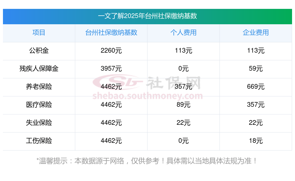 据新社通app-查阅了解到,社保基数按职工上一年度1月至12月全部工资性收入所得月平均额来确定,确定的基数用于计算社会保险费缴纳的工资基数。 目前该台州社保的缴费基数为:4462.00,个人费用约为:356.96元,企业费用约为:669.3元。