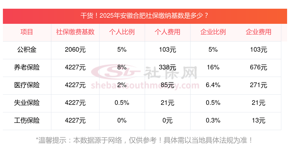 一、据新社通小编了解到,职工上一年度月平均工资作为社保缴费基数确定的关键参考,之后依据当地社会平均工资60%-300%的上下限来实施调整。 目前,安徽合肥社保缴费基数为:4227.00,个人费用约为:338.16元,企业费用约为:676.32元。