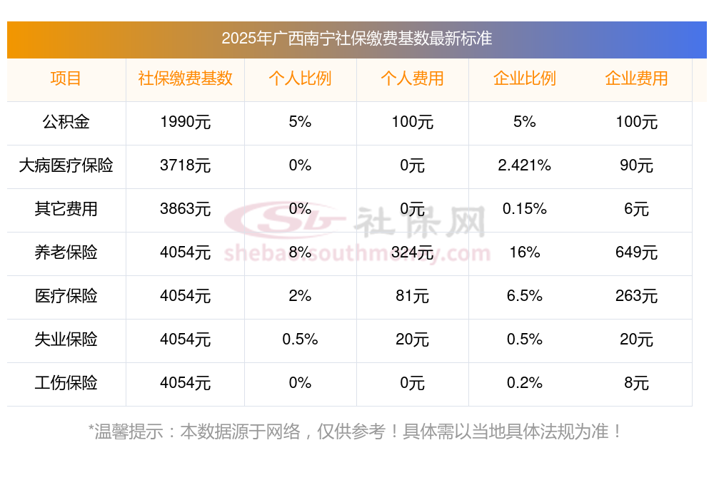 五险一金的社保扣多少钱一个月五险一金每月缴费怎么算下表是2024-2025年广西南宁社保费用明细参考,新社通app-社保缴费查询工具提供的最新数据如下: