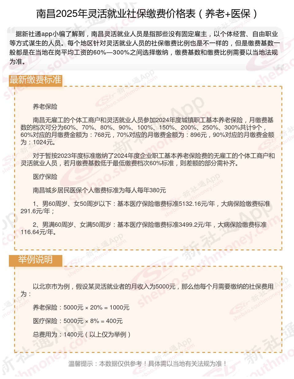 据新社通app数据显示,南昌灵活就业养老缴费基数明细如下: