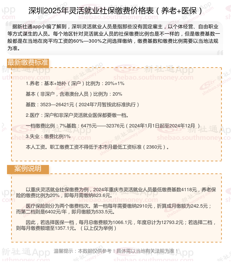据新社通app数据显示,深圳灵活就业人员养老保险缴费基数2024-2025年最新标准如下: