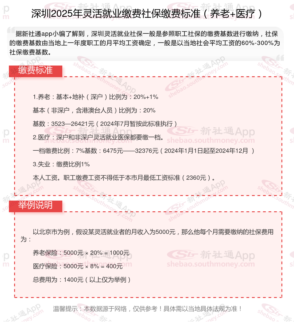 (1)深圳社保缴纳比例费用是以缴费基数为基数以一定的比例进行缴费,职工社保分为单位缴纳部分和个人缴纳部分,两者缴纳比例不同,但是灵活就业人员参保职工社保没有单位负责,将全部由个人缴费。