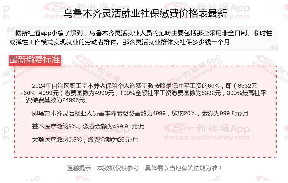 二、乌鲁木齐2024年灵活就业社保缴费基数、比例最新消息