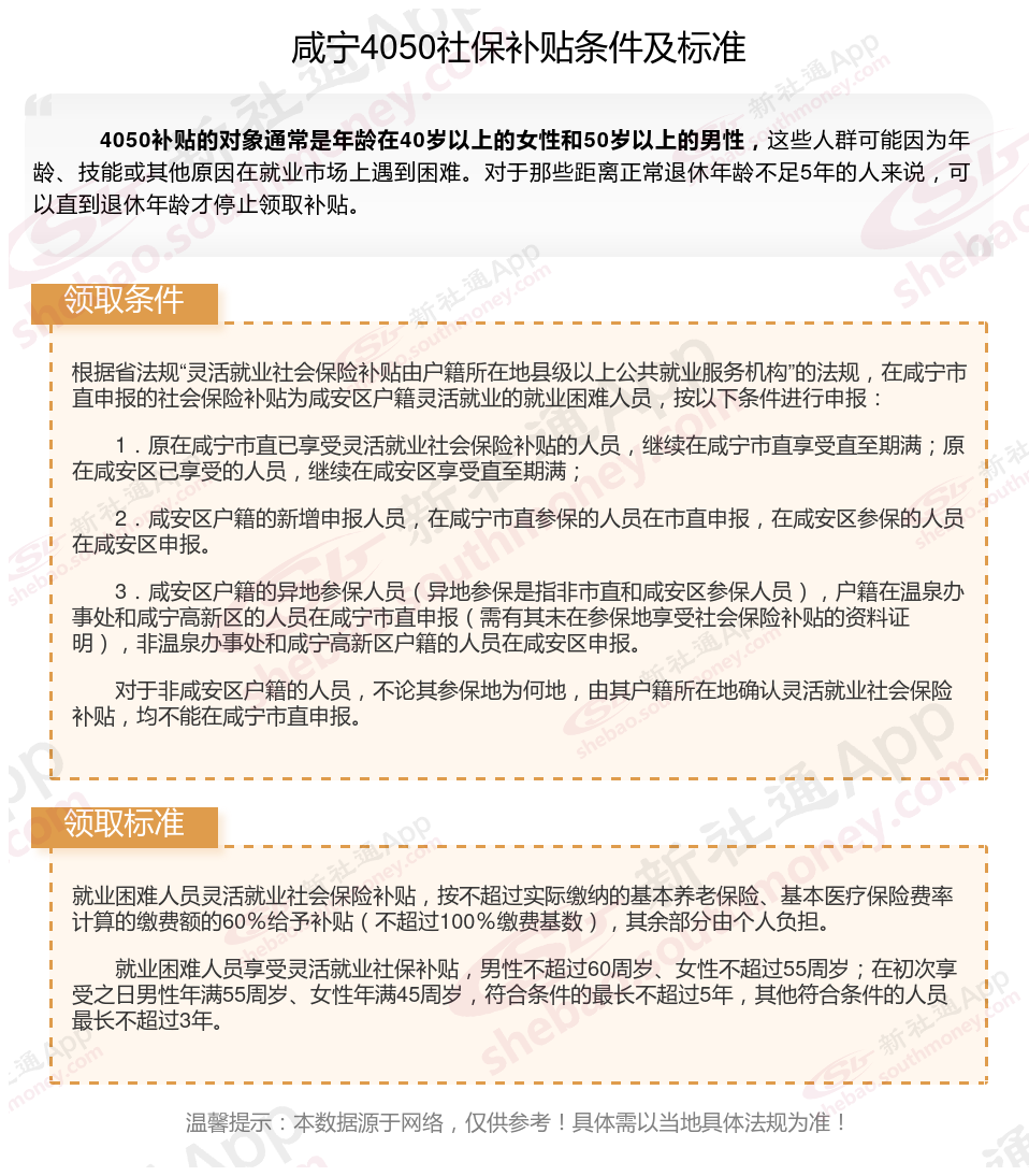 2025咸宁4050补贴主要针对的是年龄在40岁以上的女性和50岁以上的男性,这些人群通常因为年龄较大而面临就业困难。