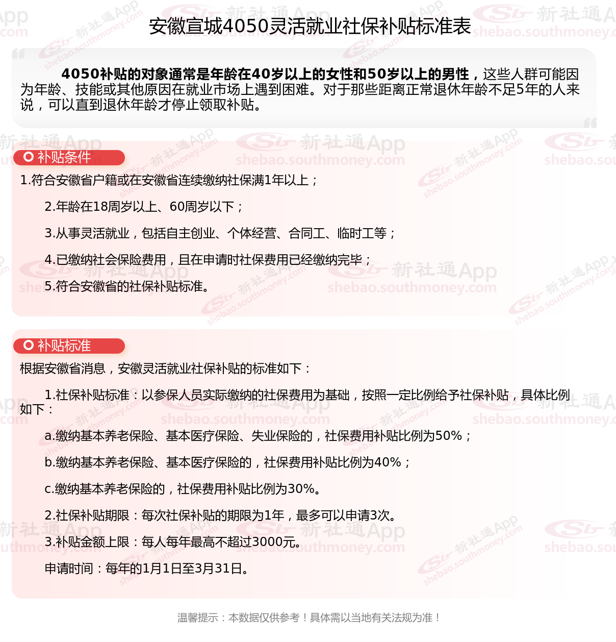 一、2025年安徽宣城灵活就业4050社保补贴标准及条件是什么(灵活就业4050社保补贴多少钱)