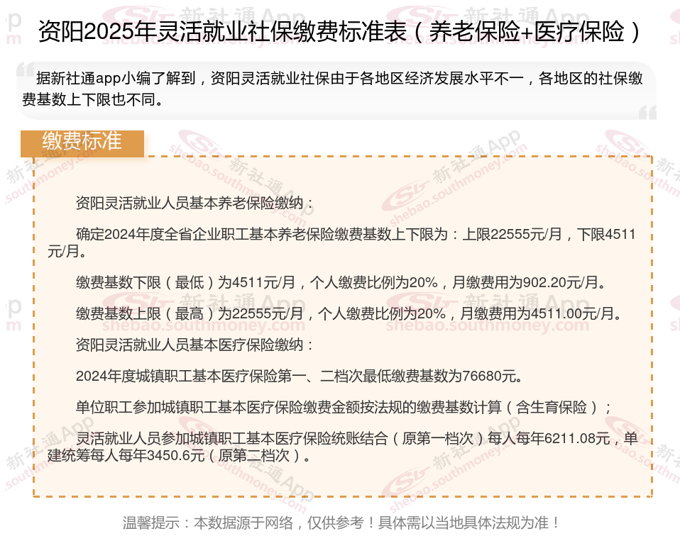 (2)资阳灵活就业社保参照职工社保的缴费基数进行缴纳。灵活就业社保由于各地区经济发展水平不一,职工月平均工资存在差异,所以各地区的社保缴费基数上下限也不同。