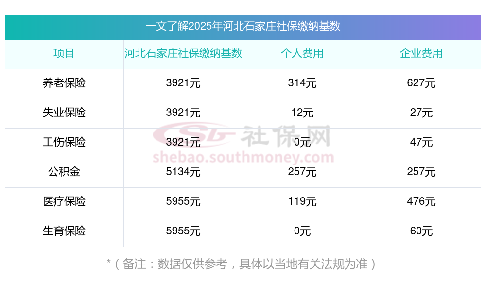 一、据新社通小编了解到,职工上一年度的月平均工资是社保缴费基数确定的重要依据,之后会结合当地社会平均工资上下限(60%-300%)来完成调整。 目前,河北石家庄社保缴费基数为:3920.55,个人费用约为:313.644元,企业费用约为:627.288元。
