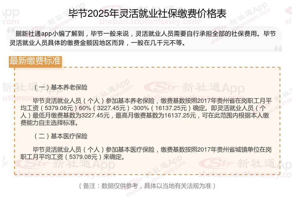 2025年毕节城镇职工社会保险缴费基数用人单位及其职工(包括有雇工的个体工商户及其雇工)分别按2024年度全口径省平的60%(4363.35元/月)和300%(24645元/月)核定缴费基数的下限和上限执行。