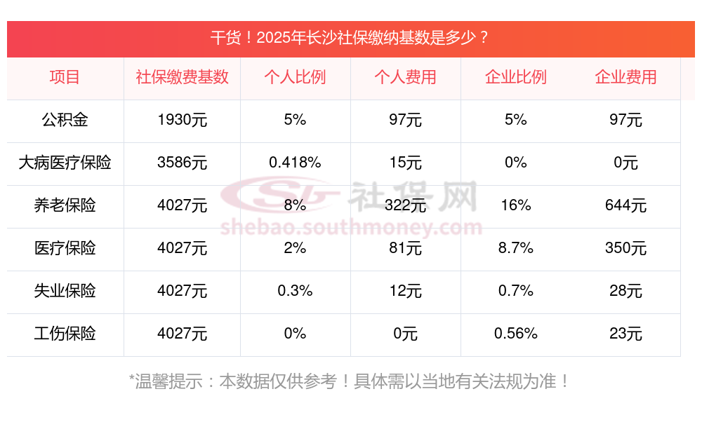 长沙社保缴费基数标准 2025年长沙社保是多少钱一个月?据新社通小编了解到,确定社保缴费基数的方法是,依据职工上一年度月平均工资,再结合当地社会平均工资上下限(60%-300%)的范围进行调整。 目前,长沙社保缴费基数为:4027.00,个人费用约为:322.16元,企业费用约为:644.32元。