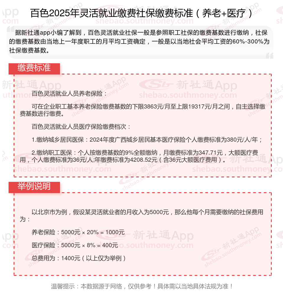 据新社通app数据显示,百色灵活就业养老缴费基数明细如下: