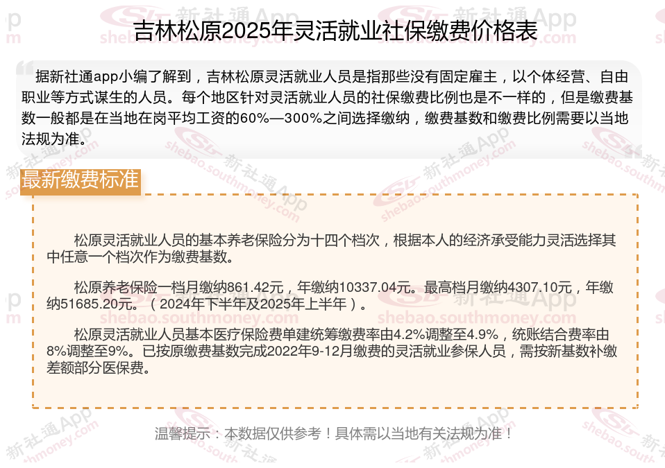 2024-2025年吉林松原灵活就业人员社保缴费标准是多少?社保交完退休能领多少钱?下表是2024-2025年吉林松原社保费用明细参考,根据新社通app-社保缴费查询工具提供的最新数据如下: