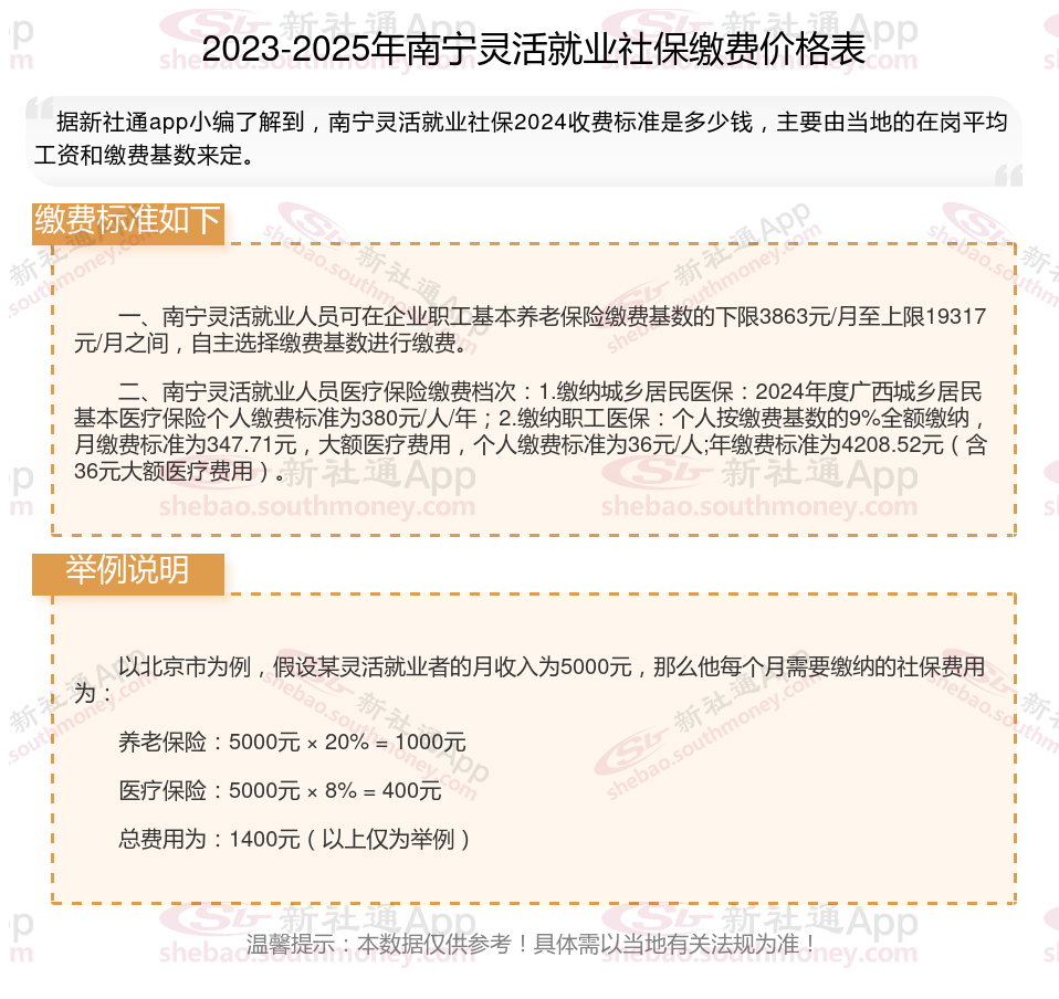 南宁灵活就业人员社保缴费标准来了 南宁灵活就业人员缴费多少钱怎么查?根据新社通app-社保缴费查询工具提供的2025社保缴费标准详情数据如下: