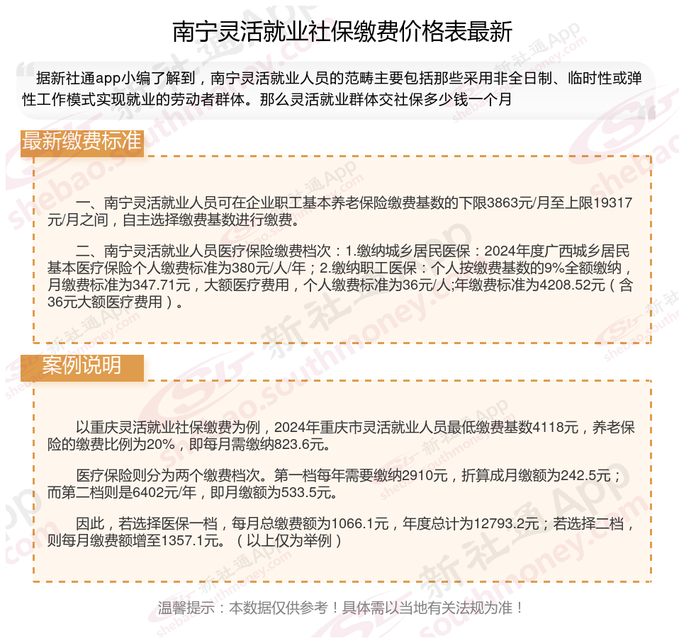 随着经济社会的不断发展,灵活就业群体不断地日益壮大,其社保缴费问题也愈发受到关注。那么2025年南宁灵活就业人员社保交多少钱,你了解2025年南宁灵活就业人员社保缴费基数及比例吗,接下来随新社通APP小编一起来看看。