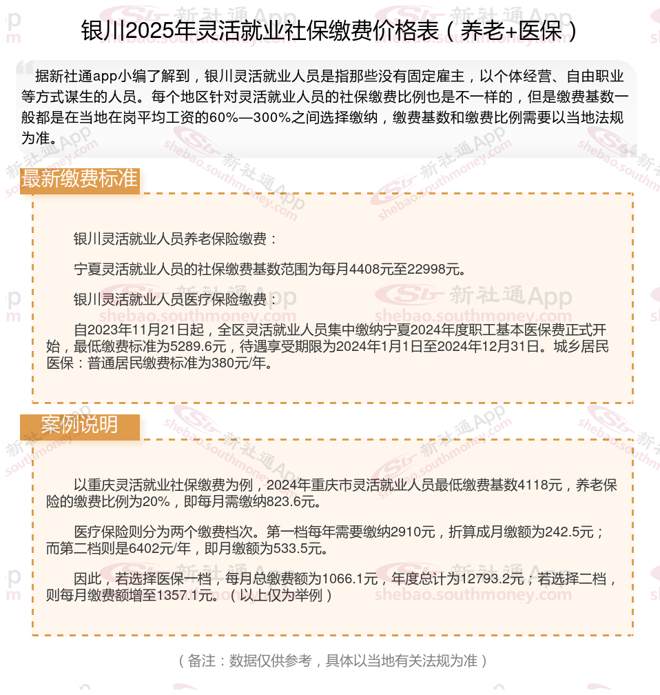 灵活就业社保缴费法规继续完善,涵盖了养老保险、医疗保险、失业保险等多个方面,旨在为灵活就业人员提供全面的社会保证。接下来随社保君了解一下2025年银川灵活就业人员社保交多少钱的详细内容。