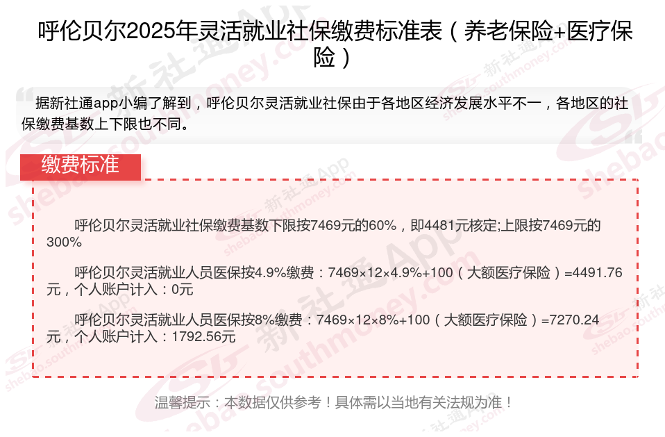 呼伦贝尔灵活就业社保缴费基数下限按7469元的60%,即4481元核定;上限按7469元的300%