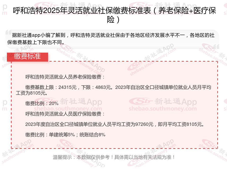 据新社通app数据显示,呼和浩特灵活就业养老保险缴费基数2024-2025年最新标准如下: