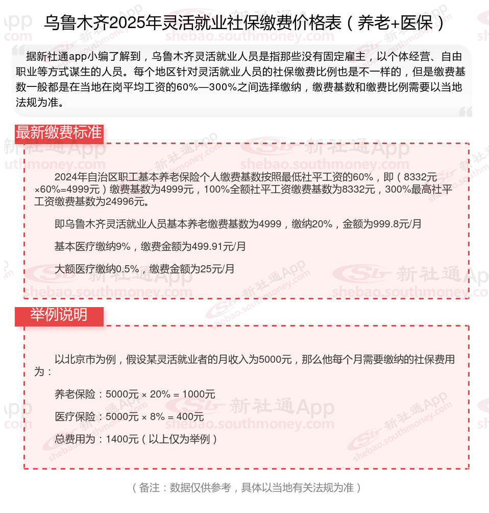 据新社通app数据显示,乌鲁木齐灵活就业养老保险最低缴费基数为:4999元;个人的缴费比例分别为:20%;
