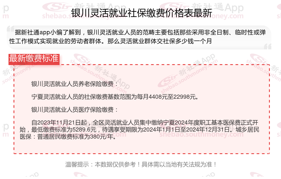 那么,银川灵活就业人员社保缴费基数最新标准,灵活就业人员自己交社保一个月得交多少钱?根据新社通app-社保缴费查询工具提供的2025社保缴费标准详情数据:
