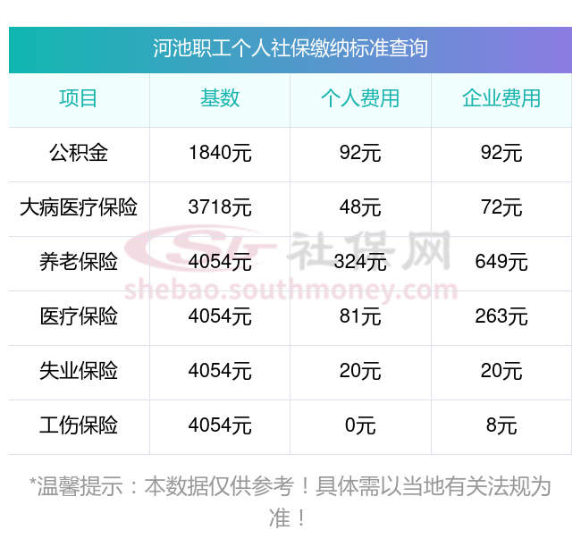 据新社通app显示,河池企业职工社保缴费基数为:3579.00元,河池职工社保费用详情如下:
