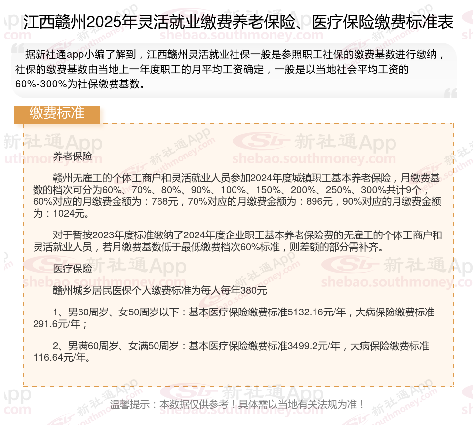 那么,江西赣州灵活就业人员社保缴费基数最新标准,灵活就业人员自己交社保一个月得交多少钱?根据新社通app-社保缴费查询工具提供的2025社保缴费标准详情数据: