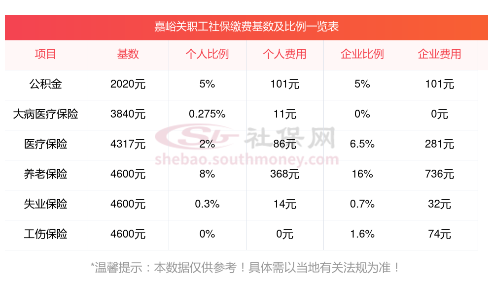 嘉峪关五险一金交多少钱一个月?下表是2024-2025年嘉峪关社保费用明细参考,新社通app-社保缴费查询工具提供的最新数据如下:
