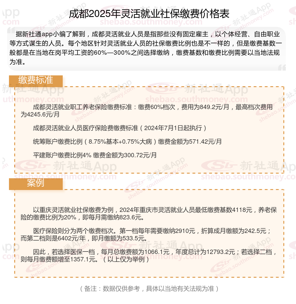 据新社通app数据显示,成都灵活就业养老保险缴费基数2024-2025年最新标准如下: