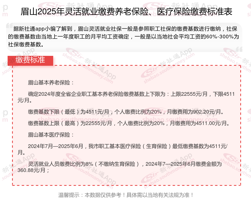 缴费标准最新公布!眉山2024-2025年度灵活就业社保缴费基数明细来了,根据新社通app-社保缴费查询工具提供的2025社保缴费标准详情数据: