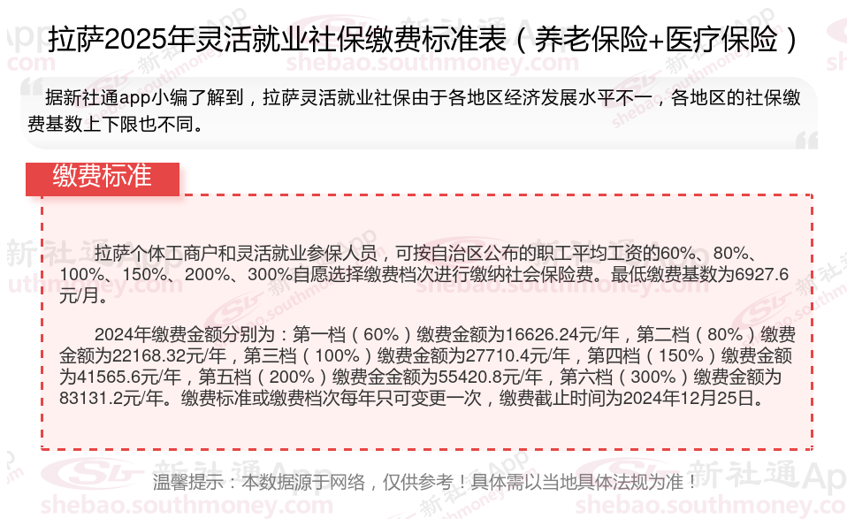 一、2025年拉萨灵活就业社保缴费标准表 拉萨灵活就业社保多少钱一个月?