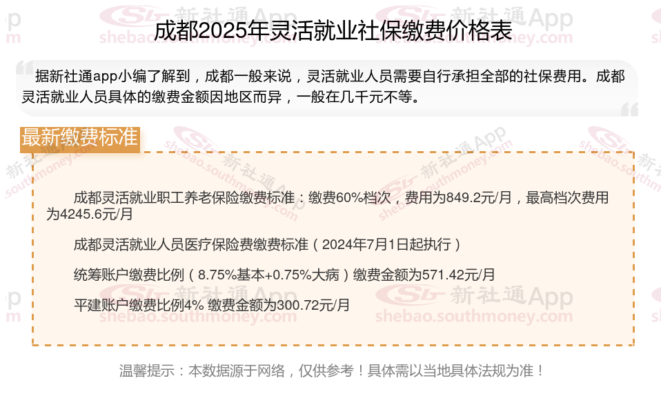 2025灵活就业社保缴费标准的调整,既体现了法规的连续性,又适应了经济社会发展的要求。灵活就业人员应根据自身情况,合理选择缴费基数和缴费比例,确保自身权益得到充分保证。那么2025年成都灵活就业人员社保需要交多少钱?下面随新社通小编一起来看看。