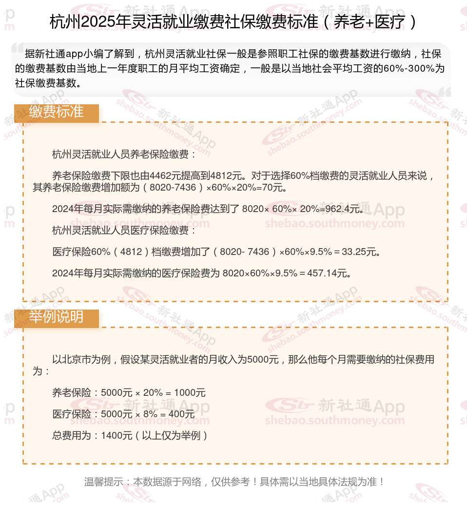 据新社通app数据显示,2024-2025年杭州灵活就业人员养老保险的缴费标准是根据缴费基数来确定的: