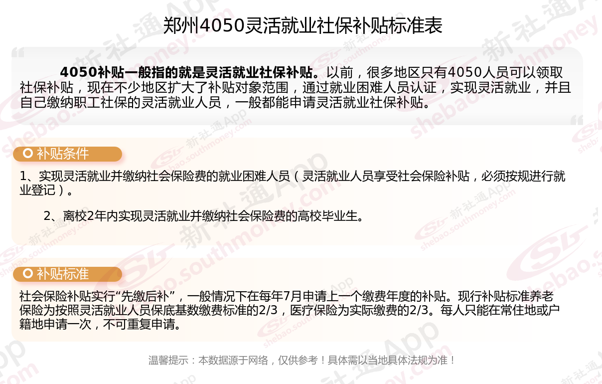二、2025年郑州4050社保补贴标准是多少?条件是什么?