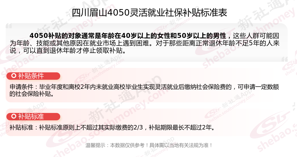一、2025年四川眉山灵活就业4050社保补贴标准和条件是什么
