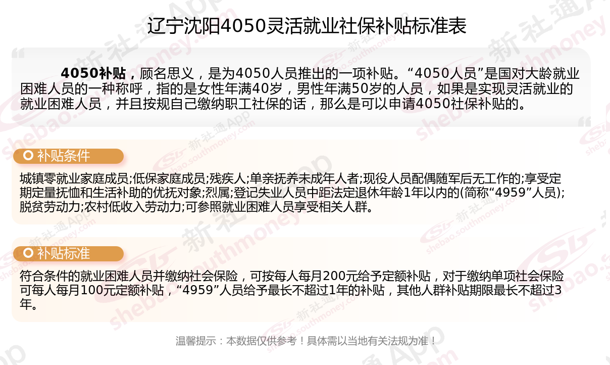 辽宁沈阳40、50、60 年出生人群补贴需要符合什么条件,4050补贴需要哪些资料?4050补贴享受对象的年龄限制为:女性年满40周岁,男性年满50周岁。